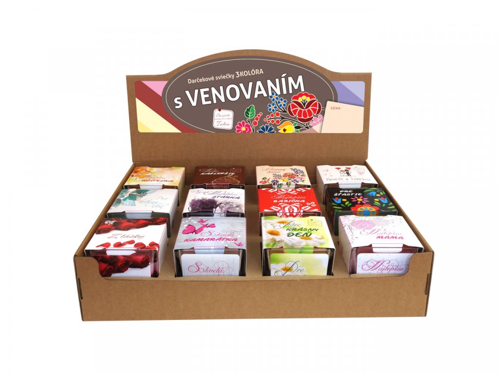 Sviečka je vyrobená z 3 farebného vosku ( 3kolóra ) a 2 knôtmi, zaliata v skle v krásnom obale so špeciálnou ražbou striebornou fóliou. Pri objednaní 12 ks sviečok podľa vášho výberu, dostanete praktický pultový papierový stojanček (krabička).