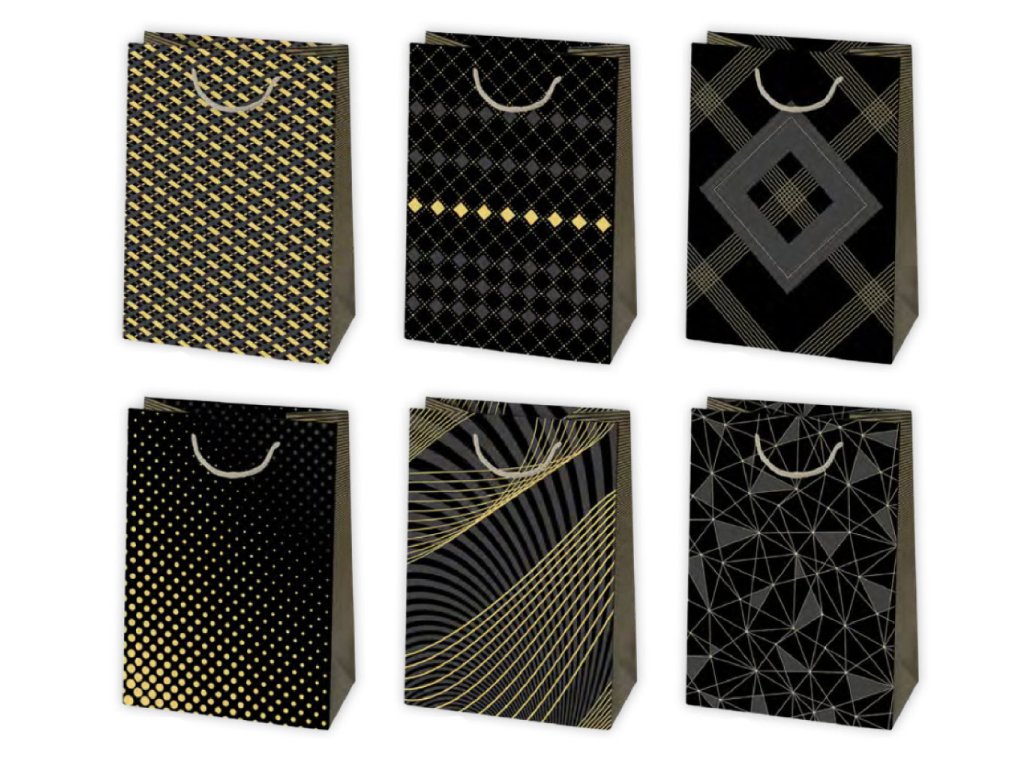 Taška je vyrobená z 200g matného papiera. Povrchová úprava - ražba zlatou alebo striebornou fóliou, reliéfna ražba. Rúčka PE tkaná. nosnosť 8kg . Pre veľkoobchodných odberateľov platí podmienka objednávať min. množstvo 10ks a jeho násobky.