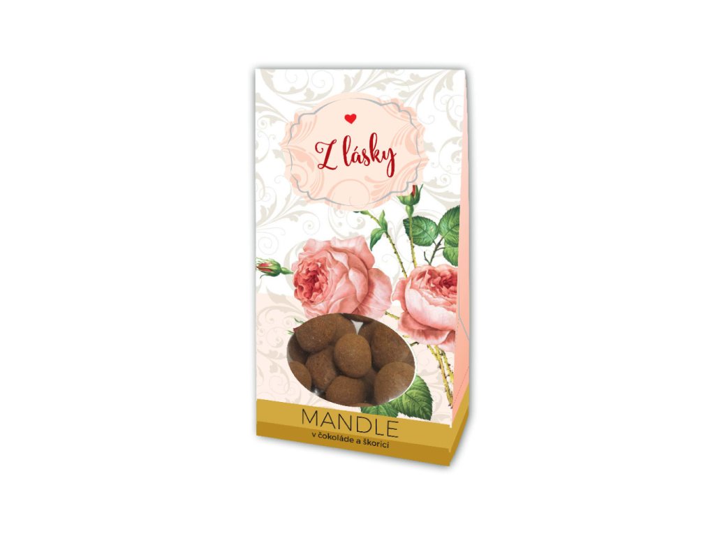 100g dražovaných mandlí v kvalitnej mliečnej čokoláde s vyberanými jadrami mandlí posypané škoricou.