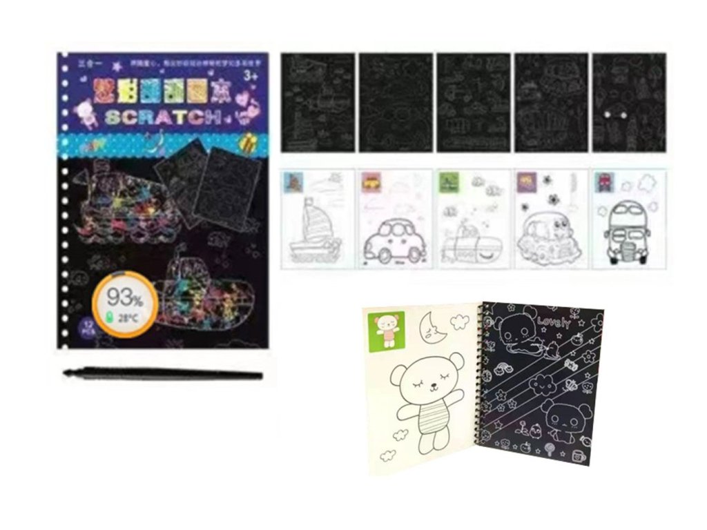 Výrobok obsahuje: 5ks predtlačených obrázkov na vyškrabanie, 5ks papierov na vyškrabanie bez predtlače, 12ks obrázokov na vymaľovanie.