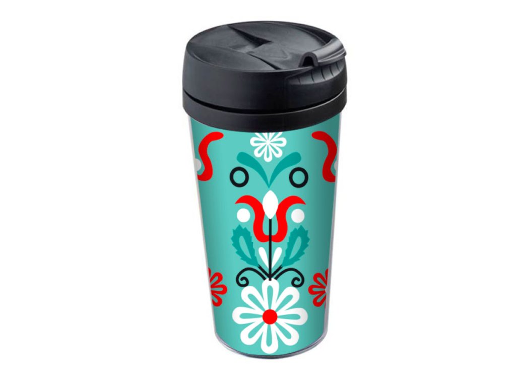 Kvalitný plastový termohrnček FOLK so silikónovým tesnením. Hrnček je balený v originálnom papierovom obale.