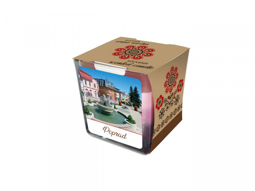 Vonná sviečka v papierovom obale. Sviečka aj obal sú dekorované motívmi mesta. Obsah textu na boku obalu: základné informácie (poloha, počet obyvateľov).